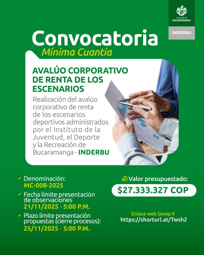 Se encuentra publicado en página web del SECOP II www.contratos.gov.co, el proceso para la contratación en la modalidad Mínima Cuantía MC-008-2025, con el objeto de “Realización del avalúo corporativo de renta de los escenarios deportivos administrados por el Instituto de la Juventud, el Deporte y la Recreación de Bucaramanga – INDERBU”.